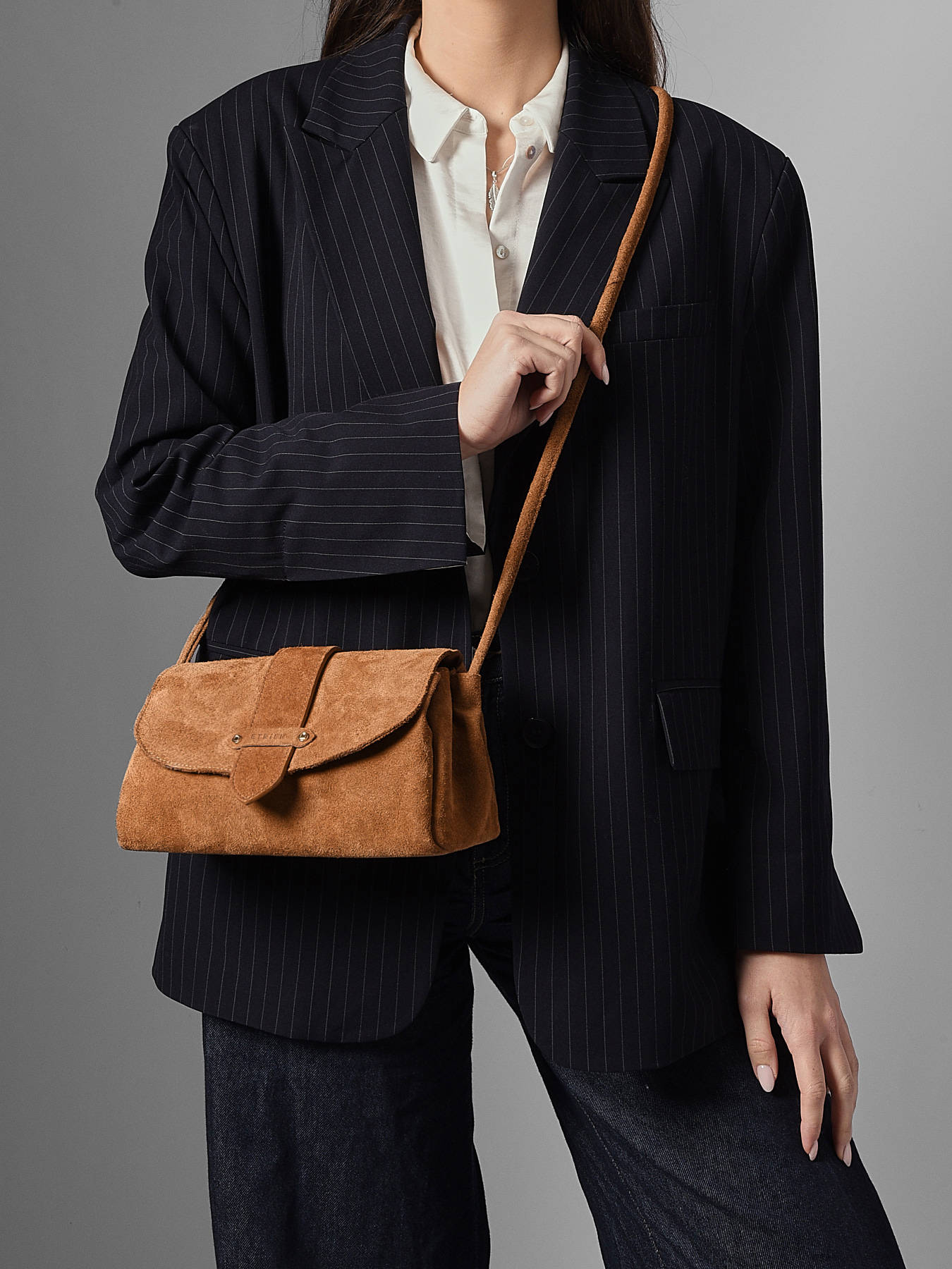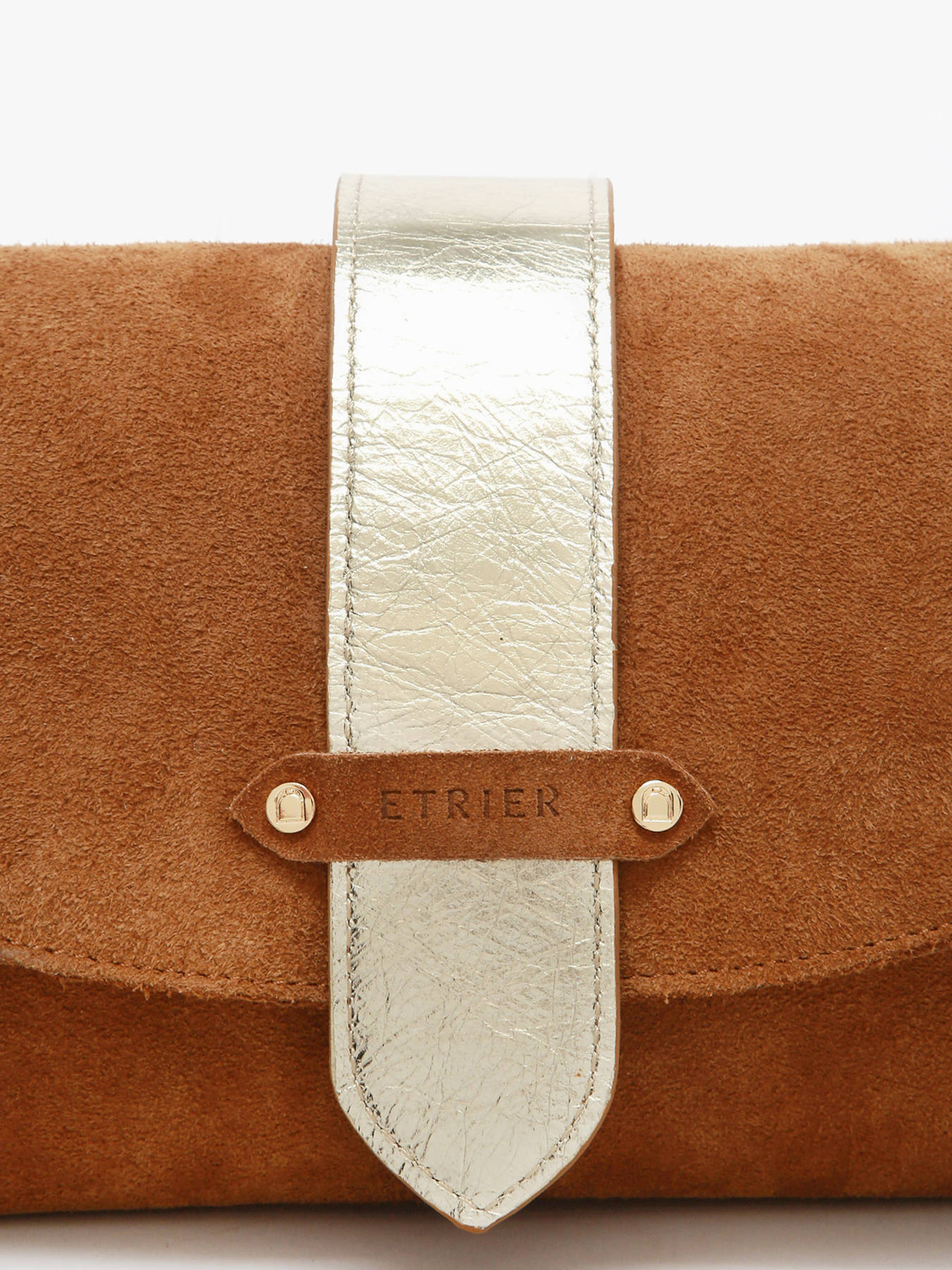 De AGNES-tas van ETRIER in maat M is vervaardigd uit Italiaans rundsleer met suède finish en sluit met een flap voorzien van een drukknoop. De stevige bodem zorgt voor een optimale vormvastheid. De omkeerbare riempje, met een goudkleurige zijde en een zijde in bijpassend leer, wordt bevestigd met twee kraagknopen en schuift in een speciaal ontworpen achtervak. De met goudkleurig leer gevoerde binnenkant omvat drie compartimenten, waaronder een centraal ritsvak, zodat u uw persoonlijke spullen gemakkelijk kunt ordenen. Het ETRIER-logo, uitgevoerd in natuurlijk leer, is voorzien van een klein Frans vlaggetje dat een elegante en onderscheidende vleugje toevoegt. De schouderriem, ingesteld op 65 cm bij levering, kan eenvoudig in hoogte worden aangepast dankzij een discrete knoop aan de binnenkant van de tas. U hoeft enkel aan het geknoopte deel te trekken, de knoop los te maken, de lengte aan te passen en vervolgens opnieuw een knoop te leggen. Dit ingenieuze systeem combineert elegantie en functionaliteit. Gemaakt in Frankrijk.