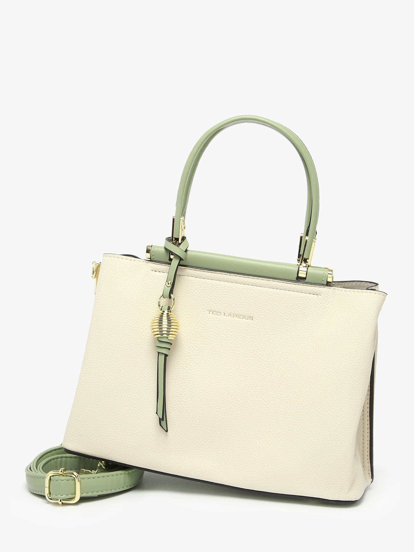 Deze Azalie handtas van Ted Lapidus zal je weten te verleiden met een minimalistisch design en vrouwelijke details. De damestas is afgewerkt met goudkleurige hardware, zoals het speelse tasjuweeltje. De handtas beschikt over een mediumgroot middenvak met rits, en twee extra steekvakken met drukknopjes aan de voor- en achterzijde. Perfect om jouw spulletjes afzonderlijk in op te bergen! Ted Lapidus voorziet een afneembare schouderriem, waarmee deze Azalie handtas gekruist of lang over de schouder kan gedragen worden.