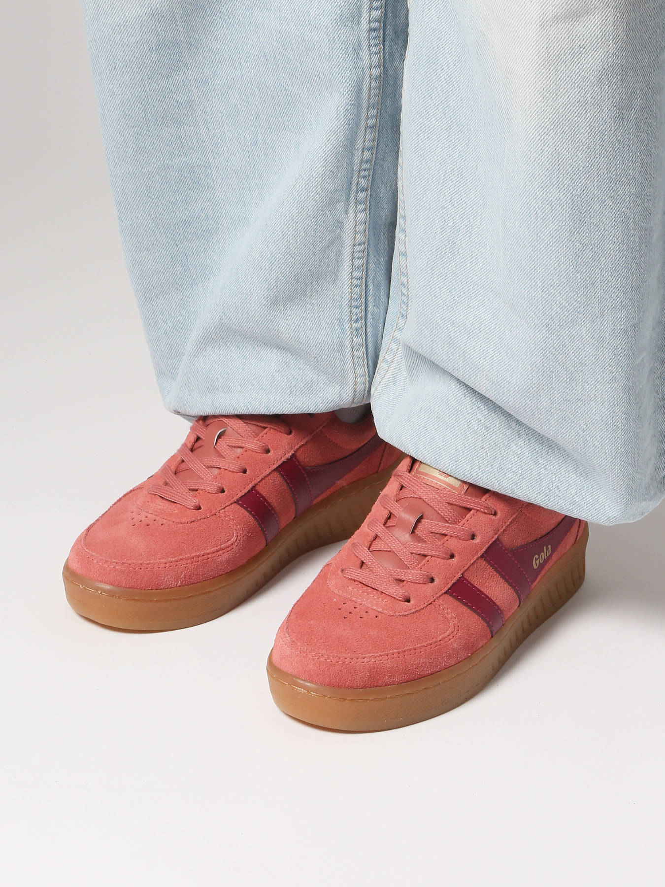 De GRANDSLAM SUEDE sneaker van GOLA herwerkt een klassieker in courtschoenenstijl met een trendy en vrouwelijke touch. Deze roze/off-white versie valt op door de roze suède bovenkant, gecombineerd met een zijlogo van Gola en een off-white hielstuk, allemaal geplaatst op een retro gumzool. Dit iconische model, geïnspireerd door het sportieve erfgoed van het merk, belichaamt perfect de balans tussen vintage stijl en modern comfort. Ideaal voor dagelijks gebruik, past het gemakkelijk bij casual en eigentijdse outfits. Een must-have voor iedereen die traditie en moderniteit elegant wil combineren.